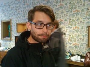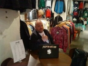 Ett annat trevligt och ofta återkommande inslag i vår butiksmiljö är Jonas. Jag pratar förstås om artisten själv – herr Wiehager. Han brukar komma in och sitta vid något bord och jobba lite. Antar att han också får mer gjort på andra platser än hans eget bord. Och det är ju alltid roligt att ha honom här