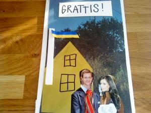 Våra grannar var så gulliga och kom in med en flaska vin och ett egenkomponerat grattiskort (dom fick reda på det några timmar innan bara) när vi gifte oss. ‘vi tog vad vi hittade’, ‘en snygg brunette och eh… Tobbe Trollkarl’… Jag vet inte hur jag ska tolka det riktigt, men det var hursomhelst väldigt gulligt av dem