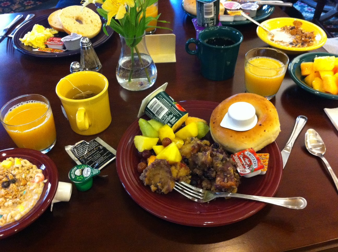 Börjar dagen med en rejäl frulle. Jag valde macka med peanutbutter jelly – grits-någonting (det var lite som uppchoppade pancakes med kaksmet och blåbär på, sött och gott) – lite frukt i sockerlag och flingor med godis i. Skackade nästan av sockerchock efter..